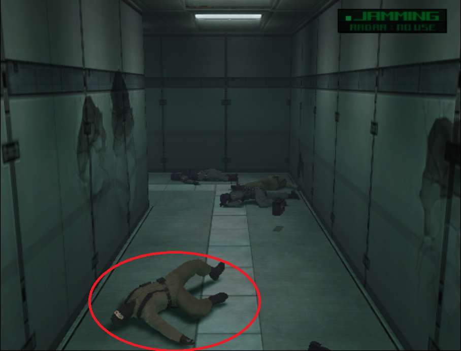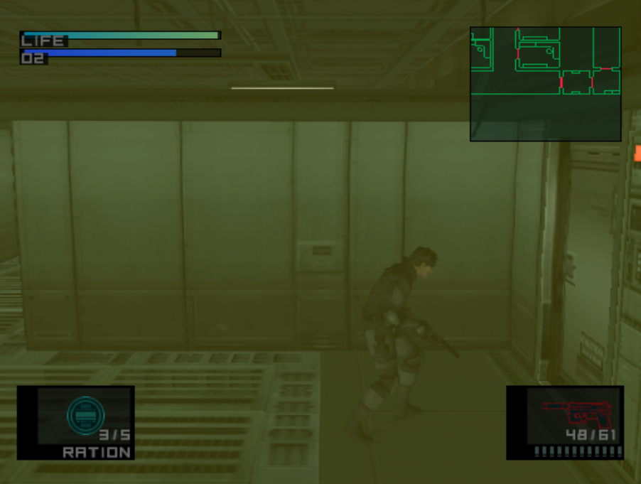 Rolling back to the gas hallway can save up to 11 frames. If you roll too early, you will lose over a second. If you roll any later in the 10 frame window, you will lose frames. Roll once Snake is at the door frame.