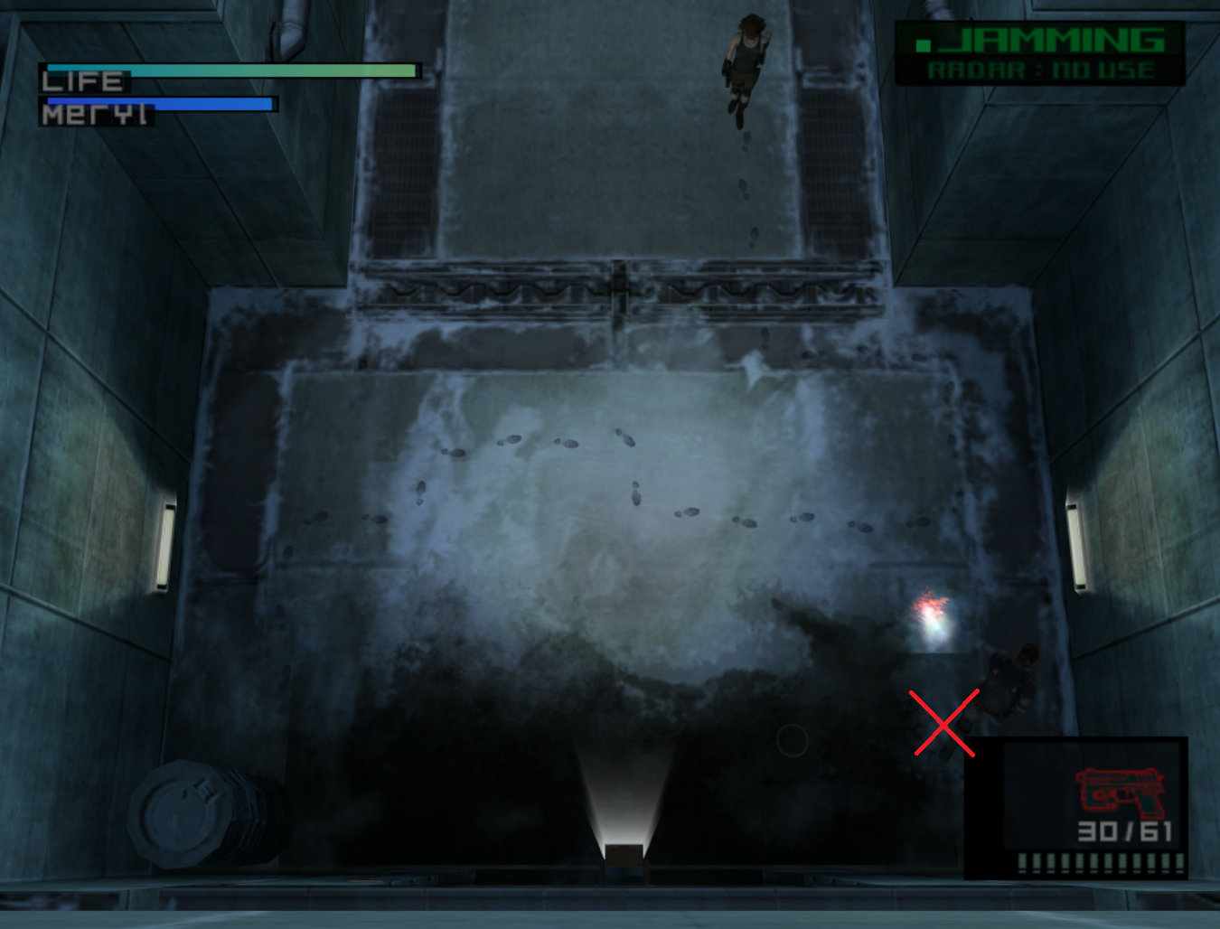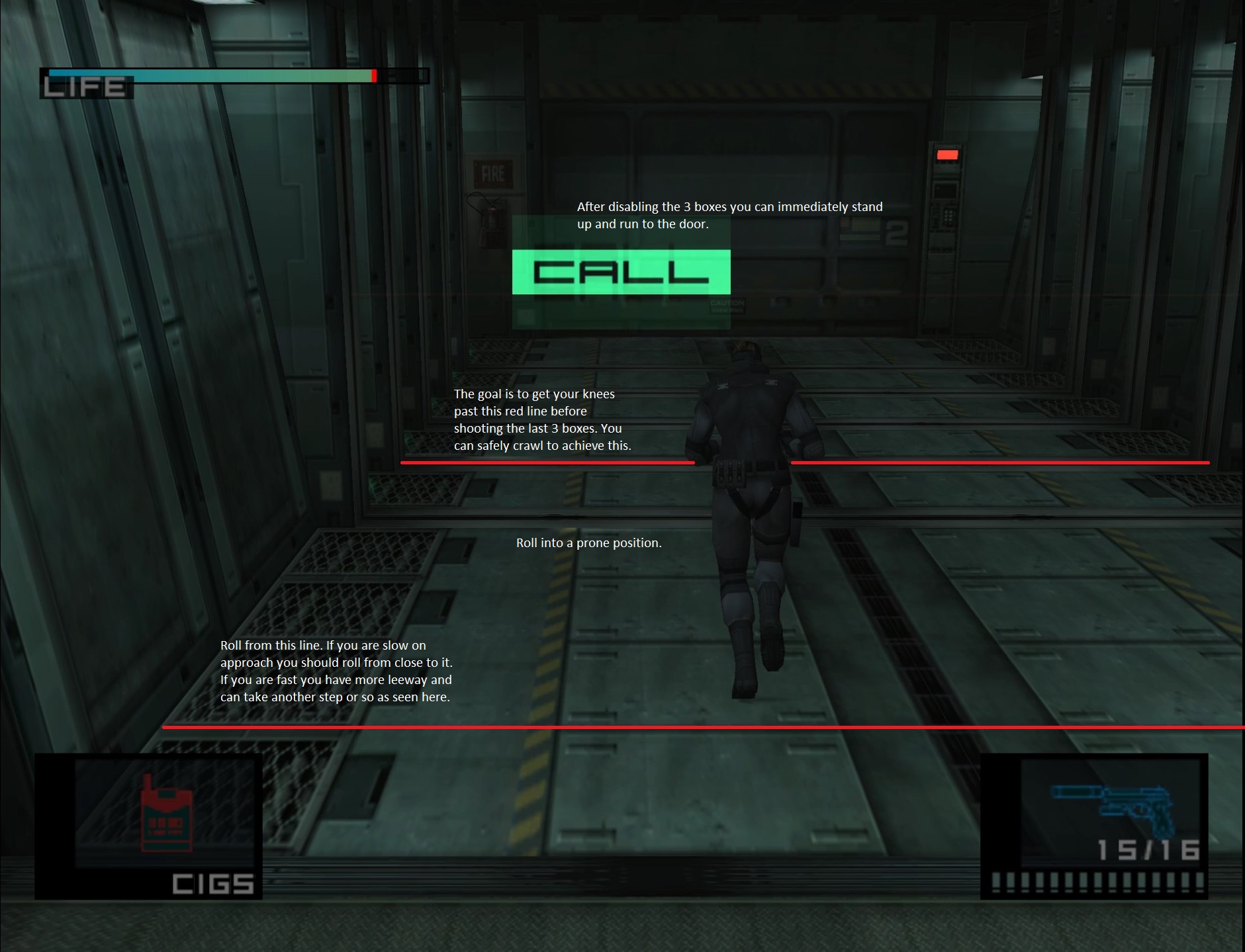 - During the Meryl codec, hold ~ 2:30 - 2:45 on the Analog stick. Skip the Cargo Door cutscene. After getting off the elevator panel, hold down right and hug the wall. Turn the corner immediately and run forward. Roll at the line shown in the screenshot. You can roll earlier, but not by much. If you roll too early or late, you will get caught. Mash right trigger to crawl faster. Enter the door while in a crawl. Recommended for advanced players.