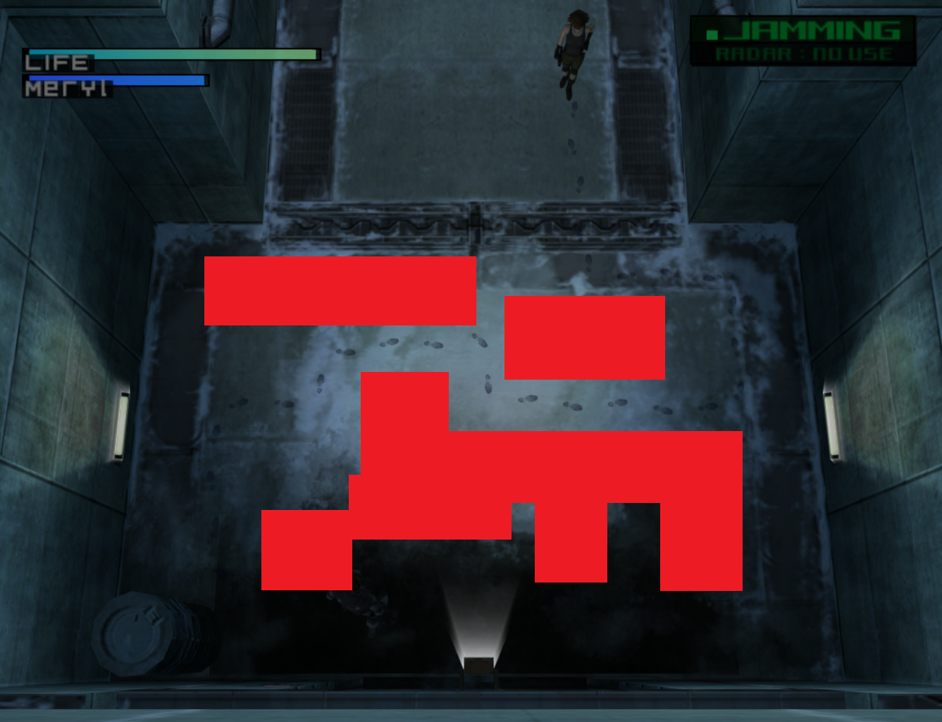 - During the Meryl codec, hold ~ 2:30 - 2:45 on the Analog stick. Skip the Cargo Door cutscene. After getting off the elevator panel, hold down right and hug the wall. Turn the corner immediately and run forward. Roll at the line shown in the screenshot. You can roll earlier, but not by much. If you roll too early or late, you will get caught. Mash right trigger to crawl faster. Enter the door while in a crawl. Recommended for advanced players.