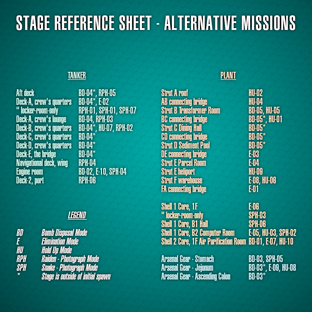 - Stage Reference Sheet for Alternative Missions: A list of which locations (stages) feature in which Alternative Missions. Useful for finding places to try stage-specific strategies at. Created by MarlonH8.