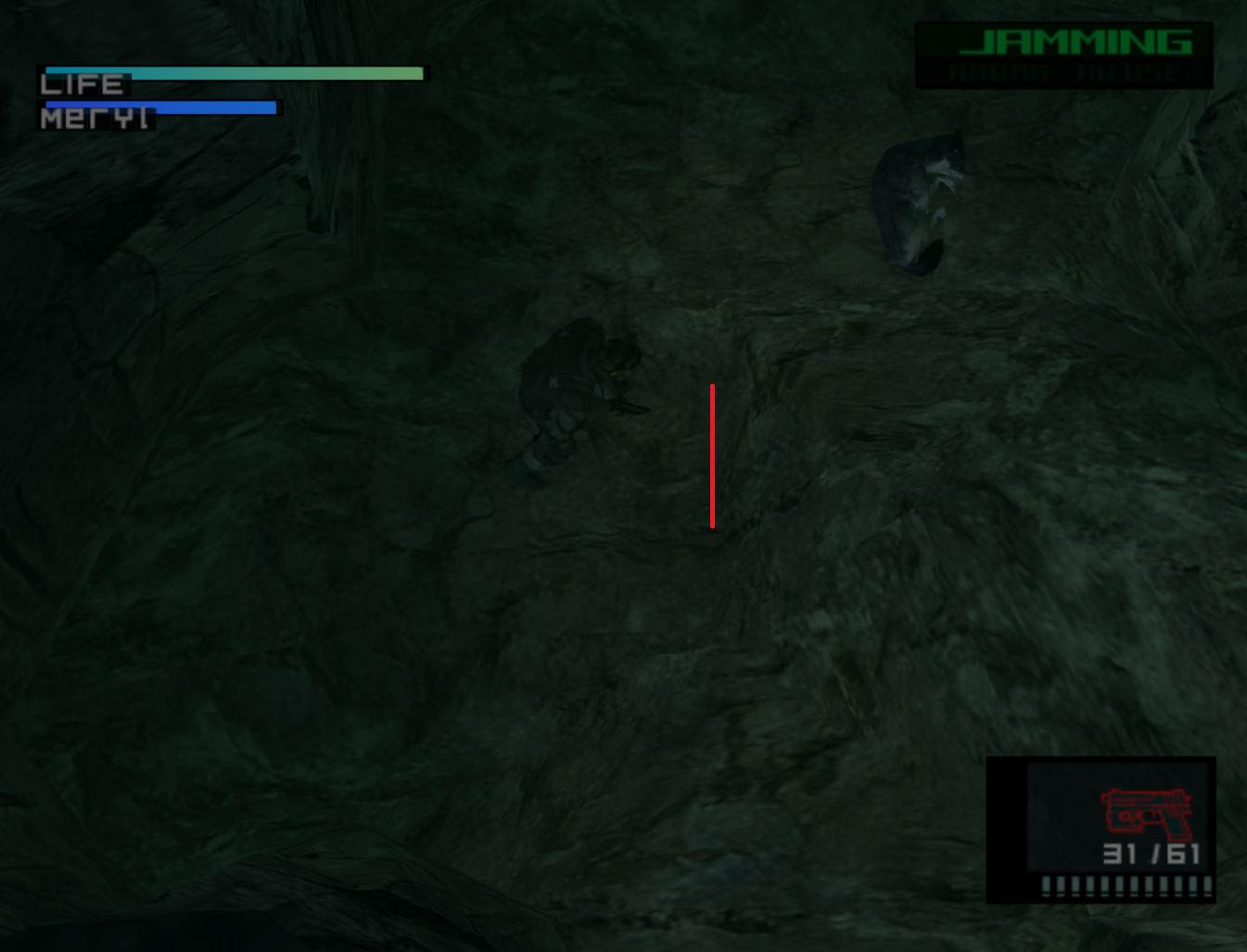 Hold right to pick up the Chaff grenades. Move up and roll at the position shown in the screen shot to save frames. If you haven't swapped to SOCOM, now is the time to do it. M9 equipped, R ◄ or ► 1 for Socom