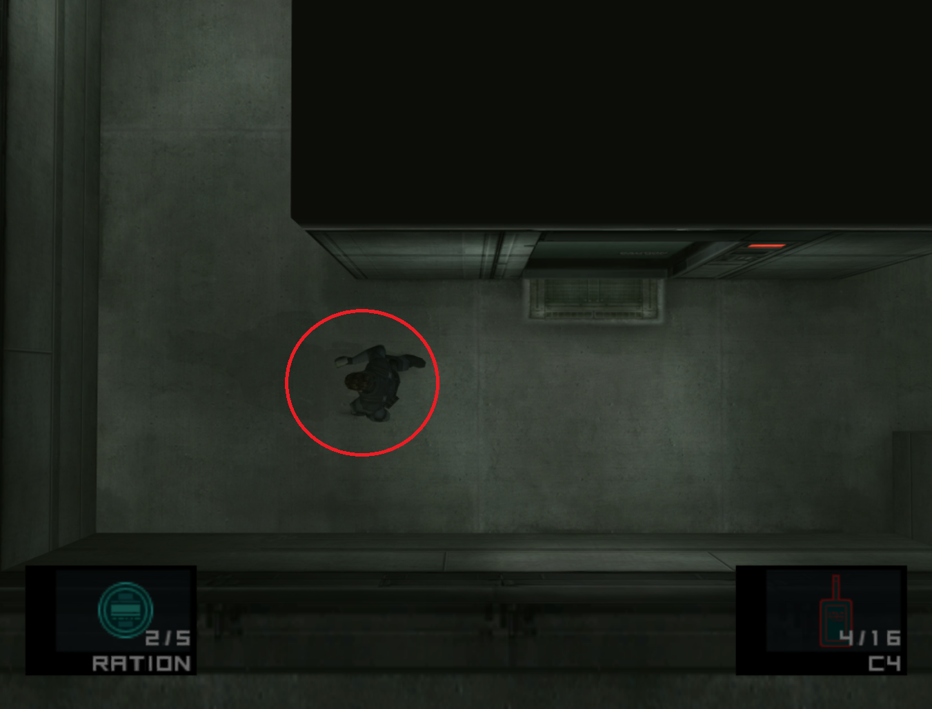 - During the Meryl codec, hold ~ 2:30 - 2:45 on the Analog stick. Skip the Cargo Door cutscene. After getting off the elevator panel, hold down right and hug the wall. Turn the corner immediately and run forward. Roll at the line shown in the screenshot. You can roll earlier, but not by much. If you roll too early or late, you will get caught. Mash right trigger to crawl faster. Enter the door while in a crawl. Recommended for advanced players.