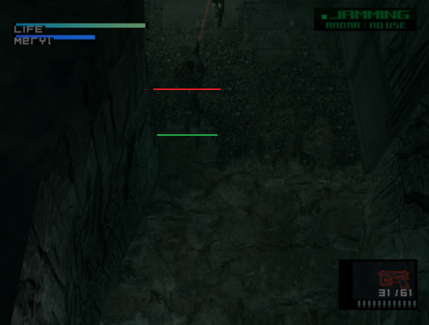 - If you cross the red line without Meryl in stun, you will get the dialog. You can shoot earlier than the green line, but it is slower. Watch the video below for examples.