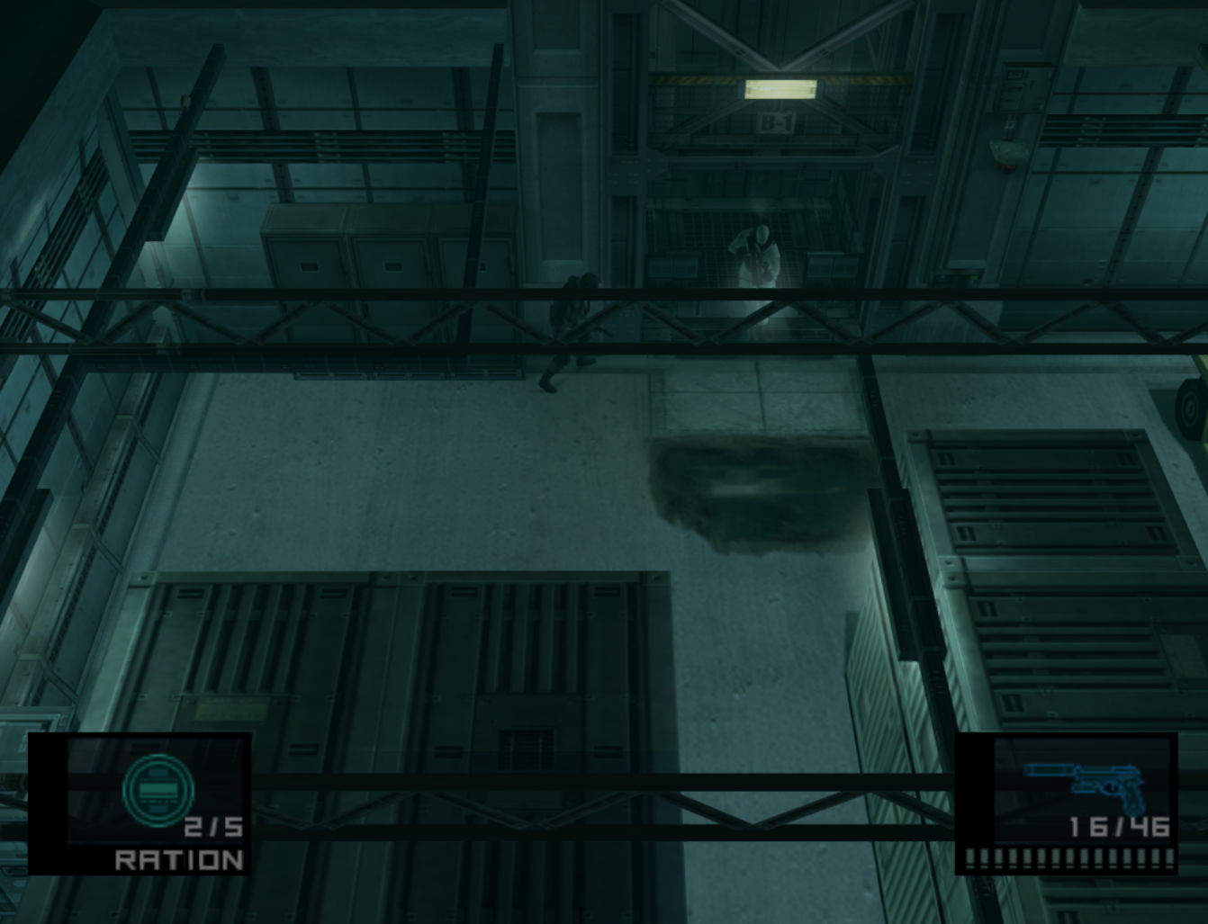- When running towards the vent guard, hold A+B to aim the M9. You need to do 3 M9 shots to knock him out. The third shot must be done while the camera is spotting you, or you will not skip the surveillance camera mini-cutscene. Tranquilizing the guard saves time from getting shot by him. Example clip