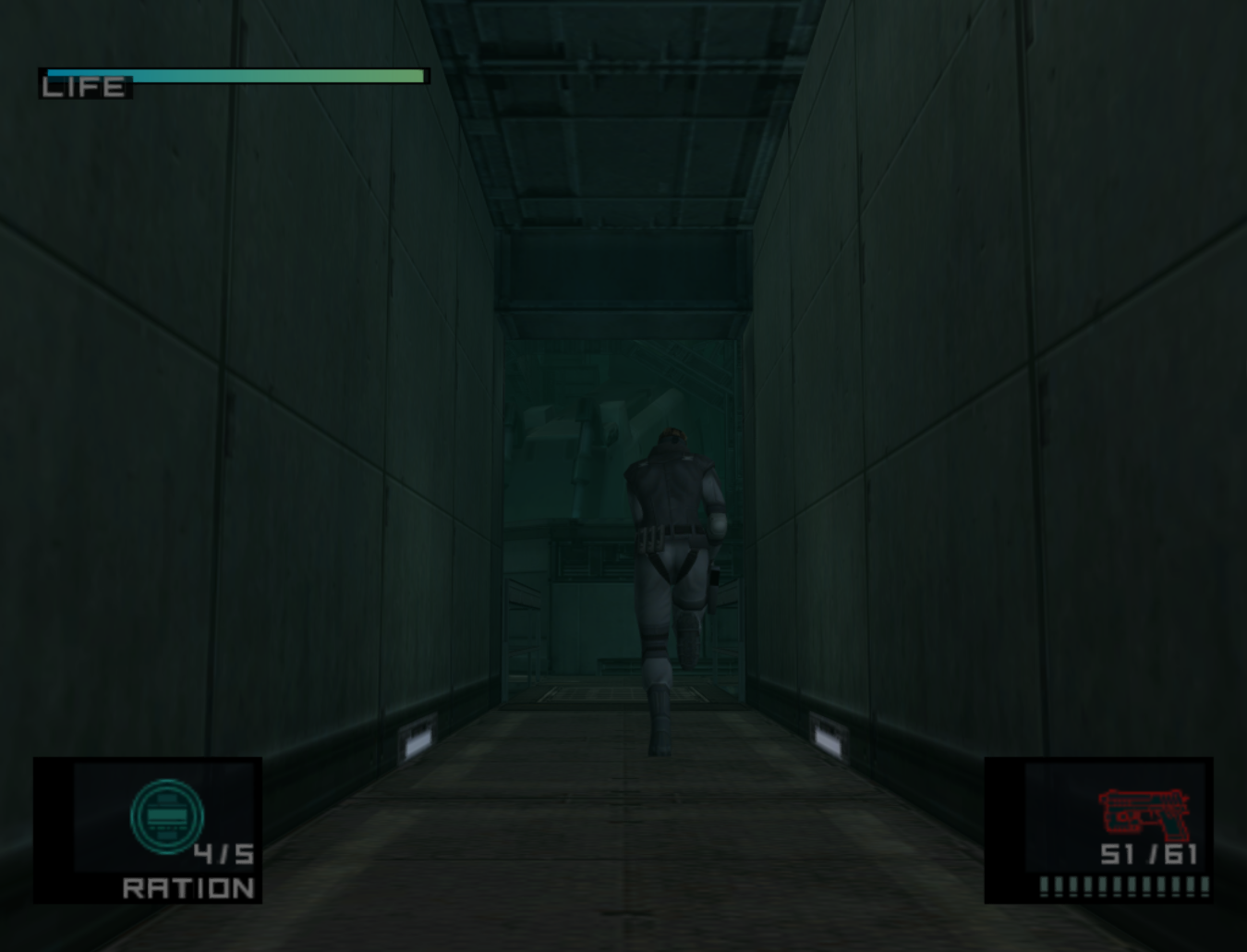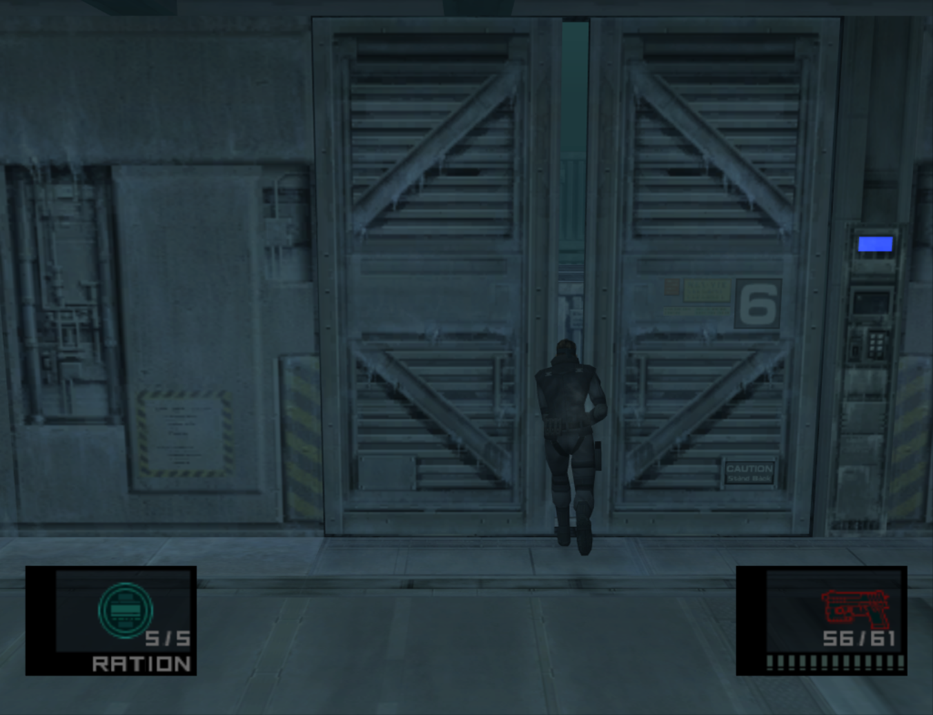- Press B to exit the call, hold left on Dpad and start. Quick change to ration. Once Snake's back is leaning against the Door, Press A.