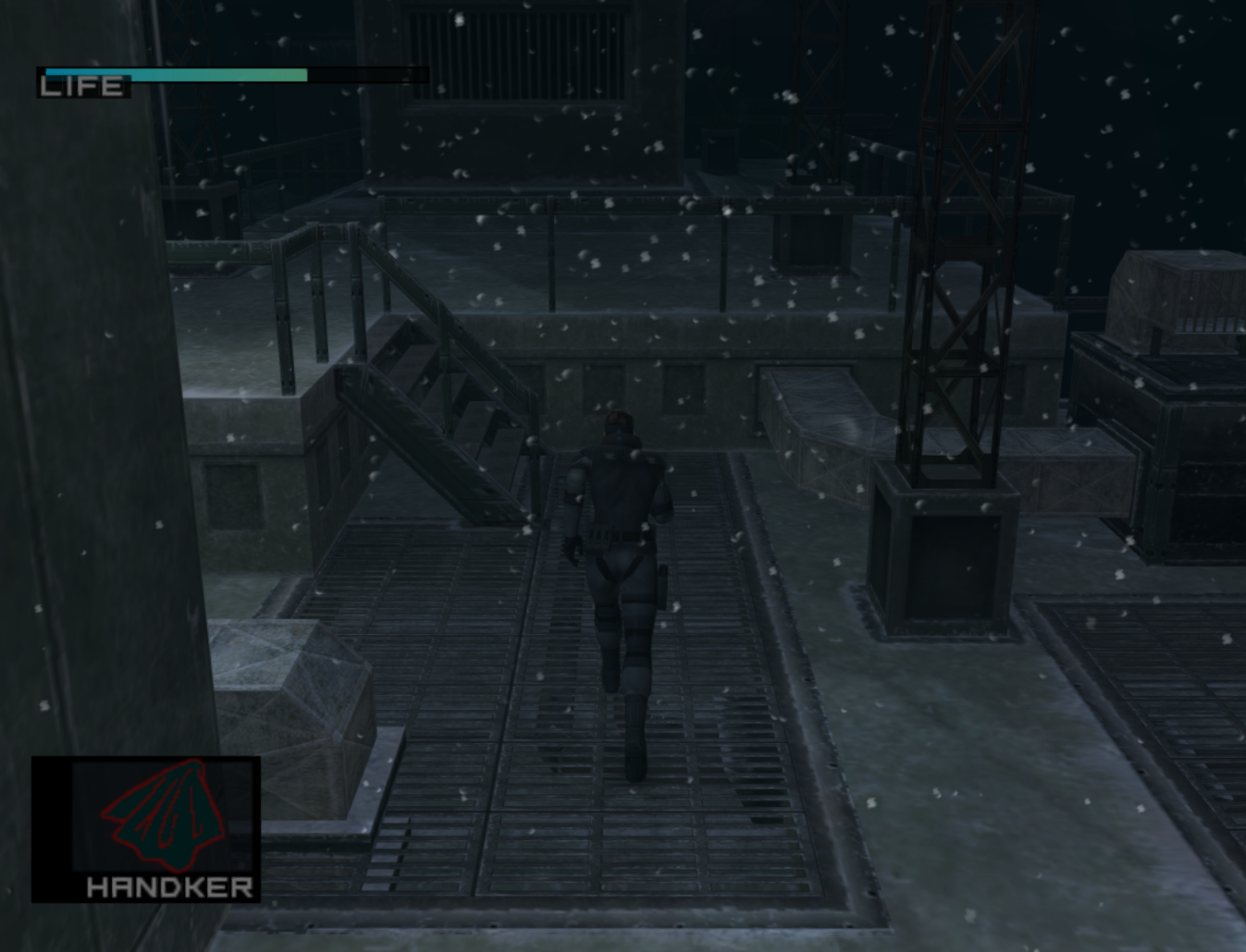 • After the first Otacon codec, run up the stairs. Once Snake is on the catwalk, FPV and headshot the guard at the railing.